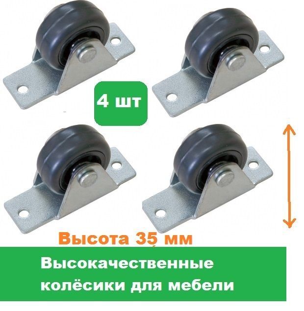Набор колёсиков отлично подойдут к любой мебели и прекрасно впишутся в Ваш интерьер. Они подходят для диванов, кресел, кроватей, кушеток, пуфов и других видов мебели. Набор состоит из 4 - х колёс, высотой 35 мм. Колёса выполнены из стали и пластика, высокого разрешения, прочные, крепкие, прослужат очень долго. Набор колёс изготовлен качественно, выполнен в привлекательном классическом стиле, который украсит мебель и интерьер. Ролики неповоротные, обладают надёжным креплением, выдерживают существенную нагрузку до 25 кг. Преимущества опоры широкий ролик не оставляет следов на напольном покрытии. Компактная конструкция практически незаметна после установки. Легко фиксируется на плоском основании дивана с помощью мебельного крепежа. Саморезы для крепления выбирают исходя из диаметра отверстий на платформе. Заходите в наш магазин у нас большой ассортимент товаров и Вы можете подобрать любые мебельные опоры любых размеров.