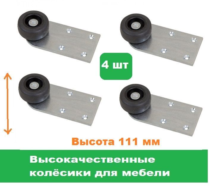 Набор колёсиков отлично подойдут к любой мебели и прекрасно впишутся в Ваш интерьер. Они подходят для диванов, кресел, кроватей, кушеток, пуфов и других видов мебели. Набор состоит из 4 - х колёс, высотой 111 мм. Колёса выполнены из стали и пластика, высокого разрешения, прочные, крепкие, прослужат очень долго. Набор колёс изготовлен качественно, выполнен в привлекательном классическом стиле, который украсит мебель и интерьер. Ролики неповоротные, обладают надёжным креплением, выдерживают существенную нагрузку до 25 кг. Преимущества опоры широкий ролик не оставляет следов на напольном покрытии. Компактная конструкция практически незаметна после установки. Легко фиксируется на плоском основании дивана с помощью мебельного крепежа. Саморезы для крепления выбирают исходя из диаметра отверстий на платформе. Заходите в наш магазин у нас большой ассортимент товаров и Вы можете подобрать любые мебельные опоры любых размеров.