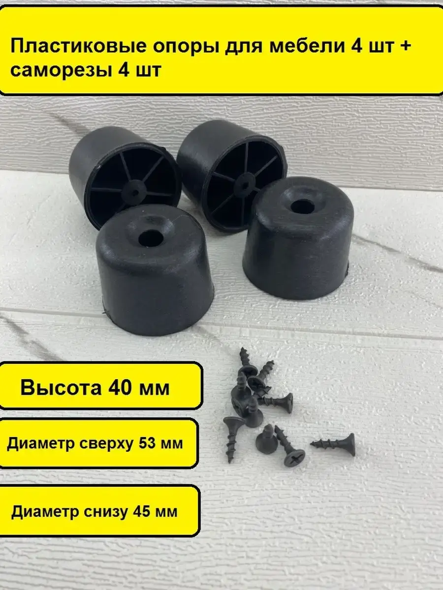 Опоры пластиковые мебельные идеально подходят к любой мебели. Опоры из пластика для дивана, кресла, стула, для стола, банкеток, пуфов, комодов, офисной мебели, журнального столика, кухонного стола, компьютерных столов и стульев. Черные ножки для кухонной мебели, корпусной мебели, кроватей, гостиной, ванны, барных стоек. Ножки выполнены из прочного пластика в классическом дизайне. Благодаря высокому качеству они очень крепкие, износостойкие, долго сохраняют первоначальный товарный вид. Внутри опоры имеются ребра жесткости обеспечивающие ее прочность. Выдерживают нагрузку до 50 кг. Комплект мебельной фурнитуры состоит из 4 опор и 4 саморез. Внутри опоры сквозное отверстие для крепежа саморезом. Размеры: высота 40 мм, диаметр сверху 53 мм, диаметр снизу 45 мм.Заходите в наш магазин у нас большой ассортимент товаров.